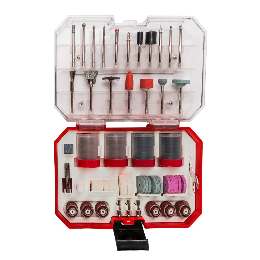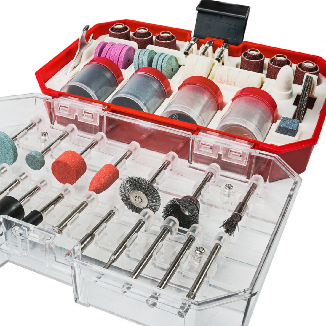 Περιλαμβάνει λειαντικές πέτρες και δίσκους λείανσης για διαμόρφωση και φινίρισμα επιφανειών, μύτες χαρακτικής για λεπτομερείς εφαρμογές σε ξύλο, μέταλλο και γυαλί, δίσκους κοπής για μέταλλο, ξύλο και πλαστικό για ακριβή κοπή, τροχούς στίλβωσης για φινίρισμα και λάμψη, συρμάτινες βούρτσες για αποτελεσματικό καθαρισμό επιφανειών και ιμάντες λείανσης σε διάφορα μεγέθη και κόκκους για μεγαλύτερη ευελιξία. Το σύνολο είναι άριστα οργανωμένο σε μία κασετίνα διευκολύνοντας τη χρήση και αποθήκευση.