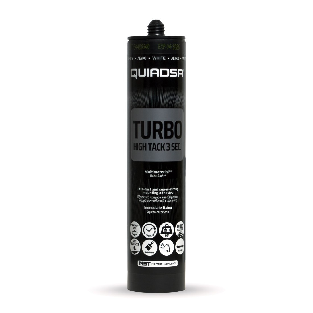 QuiadsaΥβριδικό συγκολλητικό στερέωσης\\en 15651-1: f ext-int, en 15651-3:xs, emissions dans l'air interieur a+ , ec1+\\ιδιότητες: το quiadsa turbo είναι ένα εξαιρετικά ισχυρό και εξαιρετικά γρήγορο συγκολλητικό στερέωσης ειδικά σχεδιασμένο για την ισχυρή και γρήγορη συγκόλληση όλων των τύπων υλικών (δοκιμάστε πριν τη χρήση).\παρέχει εξαιρετικά ανθεκτική, γρήγορη και εύκολη πρόσφυση.\έχει εξαιρετικές δυνατότητες συγκόλλησης σε πορώδη και μη πορώδη υλικά.\δεν προσβάλλει ή καταστρέφει ευαίσθητες επιφάνειες.\προσκολλάται σε υγρές επιφάνειες και ακόμα και υποβρύχια.\\\υγειονομικής χρήσης.\στέγνωμα 20 λεπτά.\αρχική πρόσφυση 600kg.\ανθεκτικό στη μούχλα.\καλή συγκόλληση σε υγρές επιφάνειες.\βαφόμενο.\αντοχή -40° c έως +90° c.\υψηλή αρχική πρόσφυση.\κρατάει σε 3 δευτερόλεπτα.\αντοχή στη γήρανση.\αντοχή στις καιρικές συνθήκες.\χαμηλή οσμή.\δεν συρρικνώνεται.\δεν κιτρινίζει.\μόνιμη ελαστικότητα.\χωρίς διαλύτες και ισοκυανικά.\χωρίς